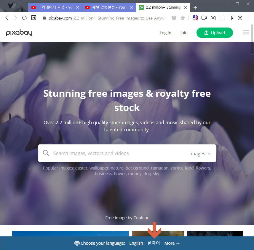 아래와 같이 한글페이지로 바뀌면 가운데 검색창에 원하는 이미지를 입력합니다.