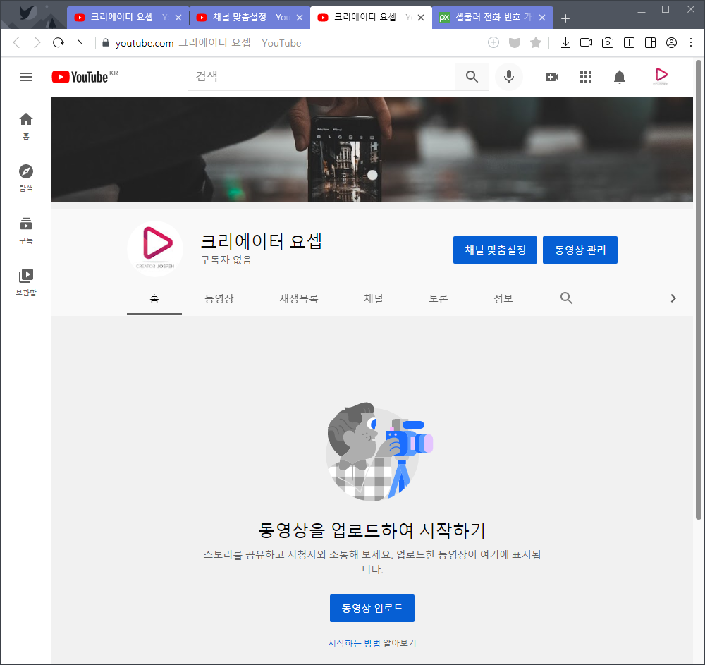 나의 채널에 배너이미지가 설치되었습니다. 조금 분위기가 만들어지기 시작하네요.