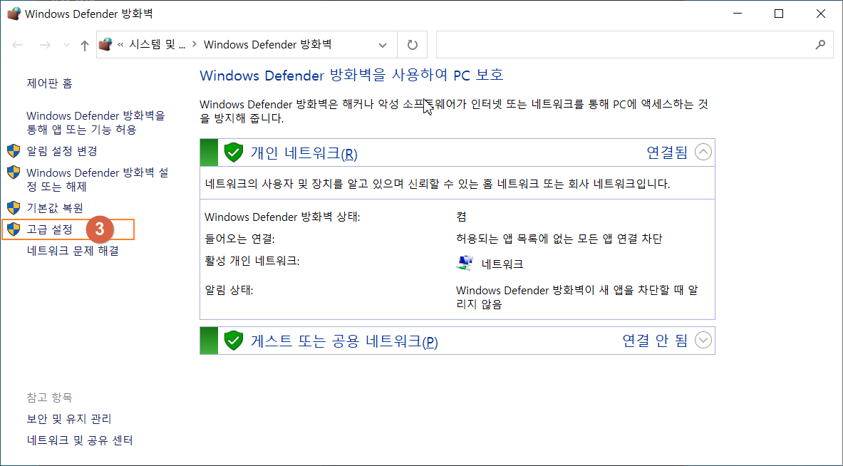 ② 검색 결과에서 'Windows Defender' 방화벽 클릭