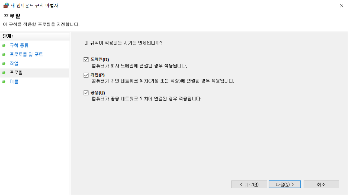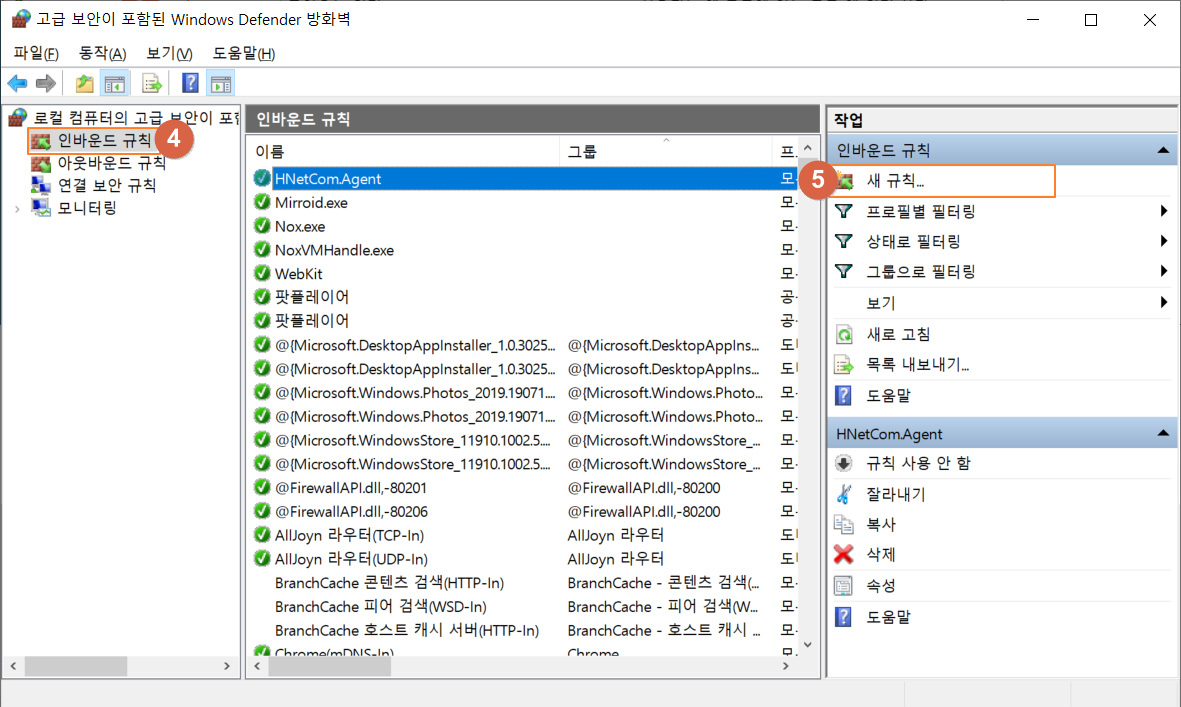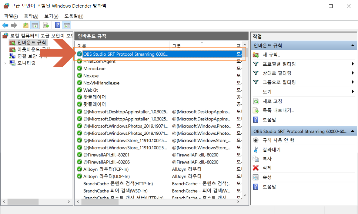 정상적으로 추가되면 아래와 같이 인바운드 규칙 목록 위에 저장한 이름이 보입니다.