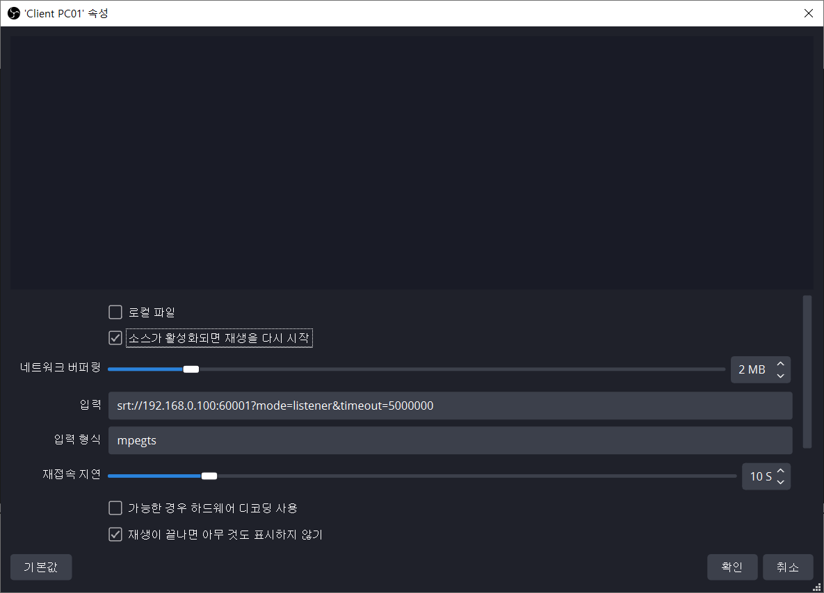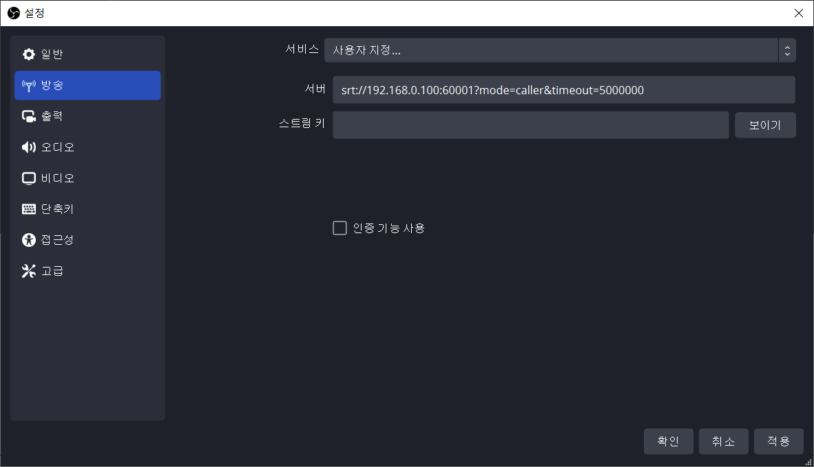 | 입력(미디어 소스) | srt://Server IP:Port?mode=listener&timeout=5000000 |