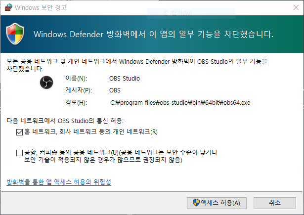 Server PC의 OBS Studio에서 미디어 소스를 추가할 때 지정하는 Port로 인해 보안 경고창이 뜰 수 있습니다.