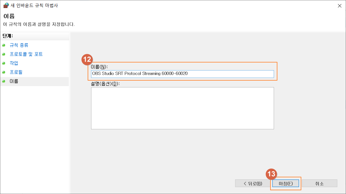 ⑫ 이름 입력: (예시) OBS Studio SRT Protocol Streaming 60000-60020