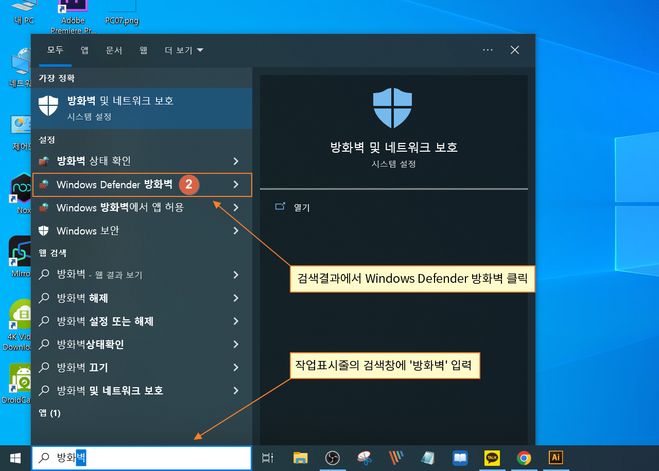 ① 작업 표시줄의 검색 창에 '방화벽' 입력