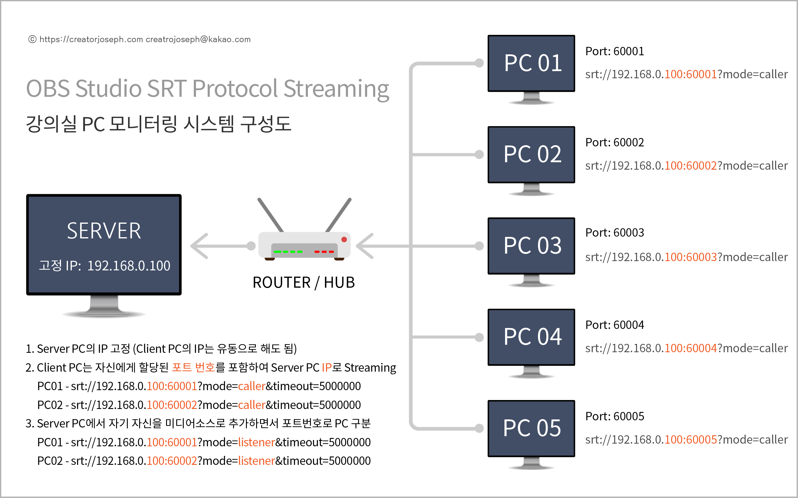 본 PC 화면 모니터링 시스템은, Local Network 상에서 별다른 추가 장비나 비용 지출 없이 OBS Studio 하나만 사용하여 Streaming System을 구축하고 강의실에 있는 교육생들의 PC 화면을 모니터링할 수 있습니다.