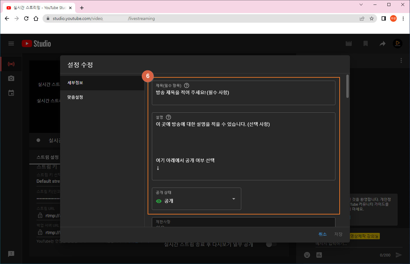 ⑥ 방송 제목과 설명을 입력하고 공개 여부를 선택합니다.