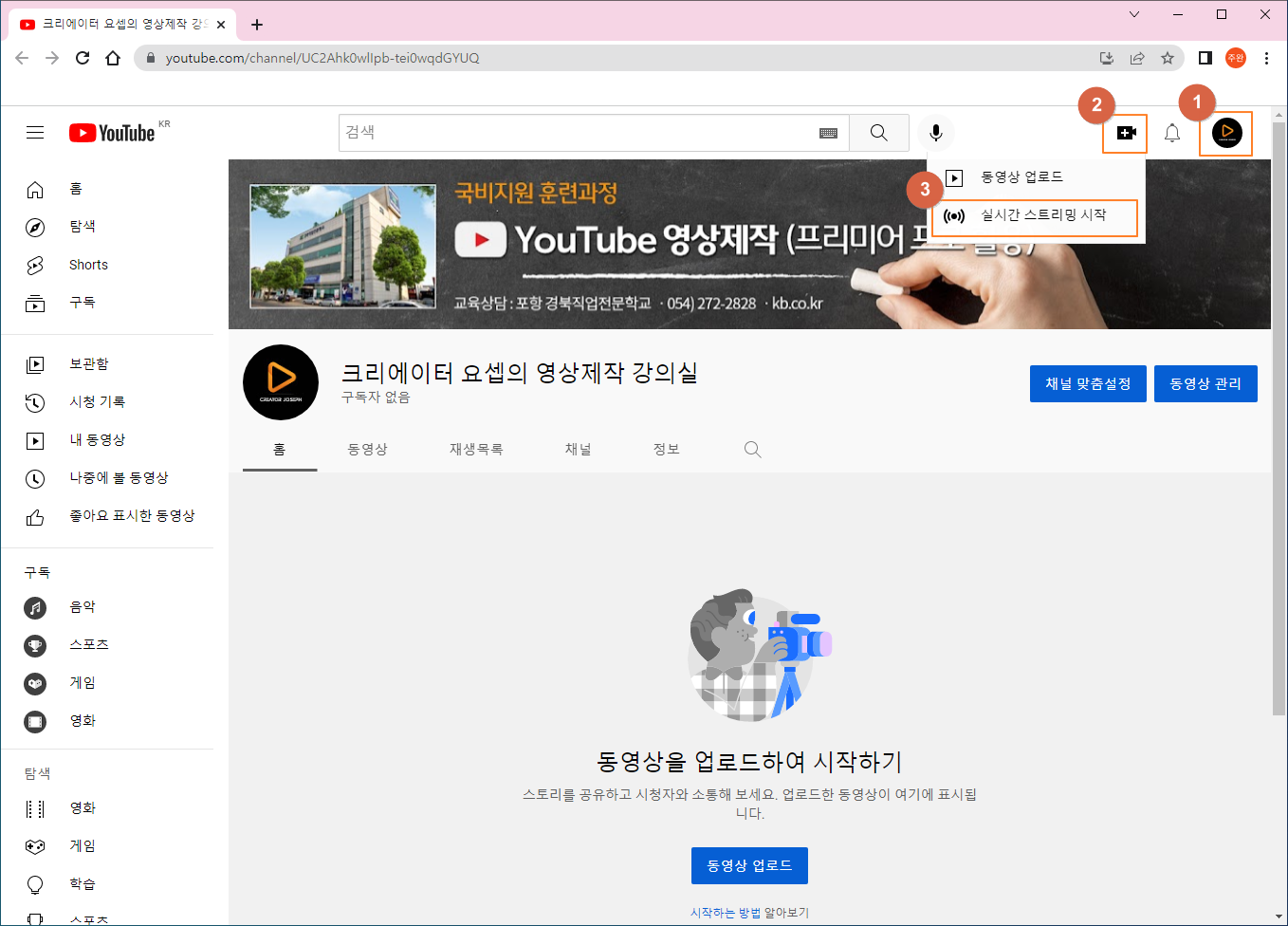 유튜브에서 라이브 방송을 하는 방법은 두 가지입니다.