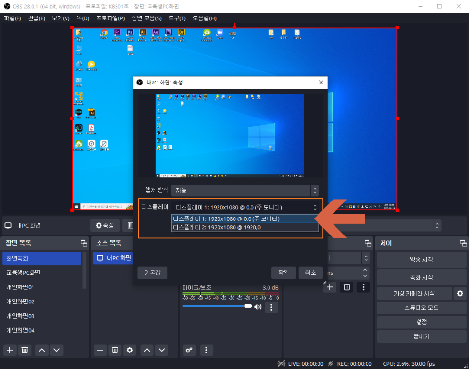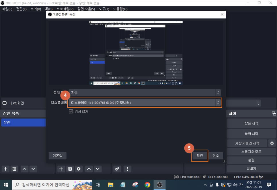 ④ 디스플레이 선택 (듀얼 모니터를 사용한다면 이곳에서 OBS 스튜디오에서 사용할 디스플레이 선택)