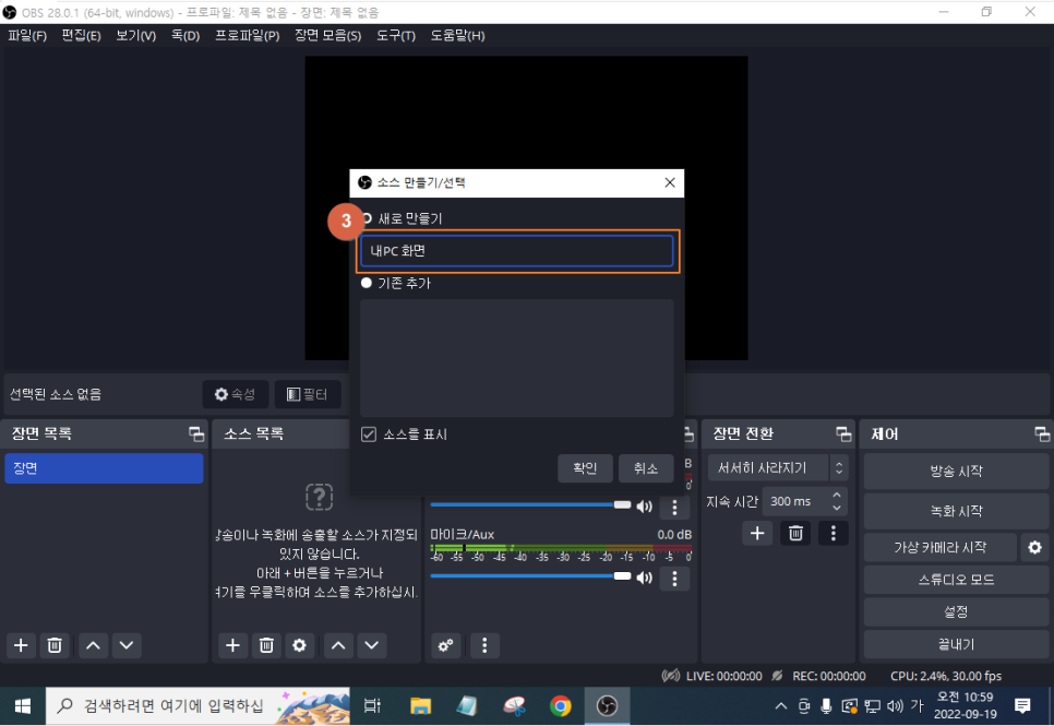 ③ 새로 만들기 항목에서 소스 이름 입력 (예시: 내 PC 화면)