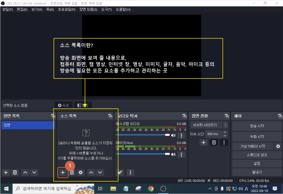 ① 소스 목록 창에서 [ + ] 버튼을 눌러주세요.