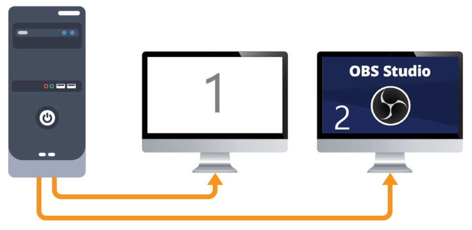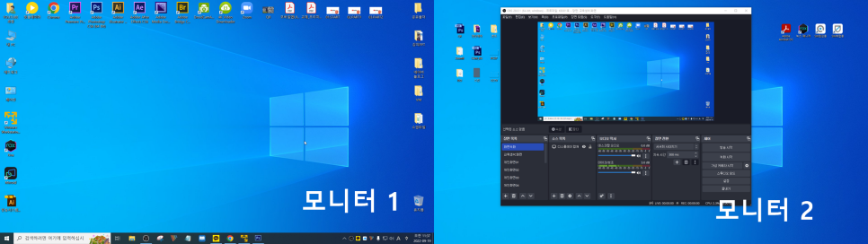 일반적으로 PC 1대에 모니터 1대를 사용합니다만, OBS를 이용해서 컴퓨터 화면을 보여주며 진행하는 방송을 원활하게 하기 위해서는 듀얼 모니터 시스템(Dual Monitor/ 모니터 2대 연결 사용) 시스템을 권 장합니다.