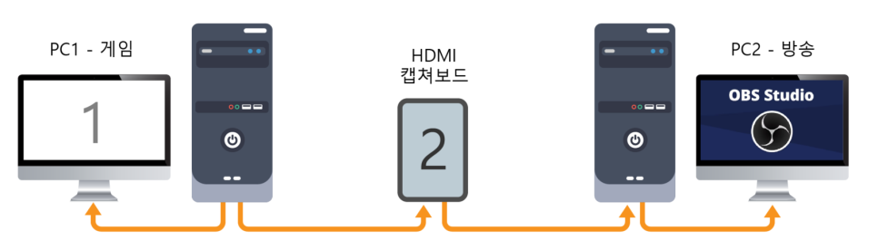 게임 방송을 한다면, HDMI 캡처 보드(또는 카드)를 사용해서 두 대의 PC를 서로 연결하여 방송하기도 합니다. 이때, PC 2에 연결된 HDMI Capture Board가 PC1의 2번 모니터 역할을 합니다.