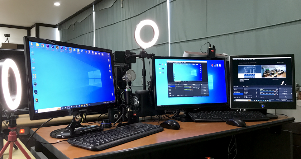 강의용 PC는 듀얼 모니터를 구성하였으며 모니터 1번의 화면이 빔프로젝터와 연결되어 있고 모니터 2번은 보조 모니터로 활용하면서 OBS 스튜디오를 띄워 놓고 방송화면 전환 및 제어를 하고 있습니다.
