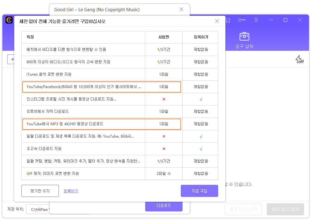 아쉽게도, 무료 버전은 한개의 영상이나 음악을 다운로드할 수 있습니다. 하루에 하나인지 한 번 설치하고 하나인지는 확실하게 명시가 안되어 있습니다. 이 부분은 따로 확인되면 적어놓겠습니다.