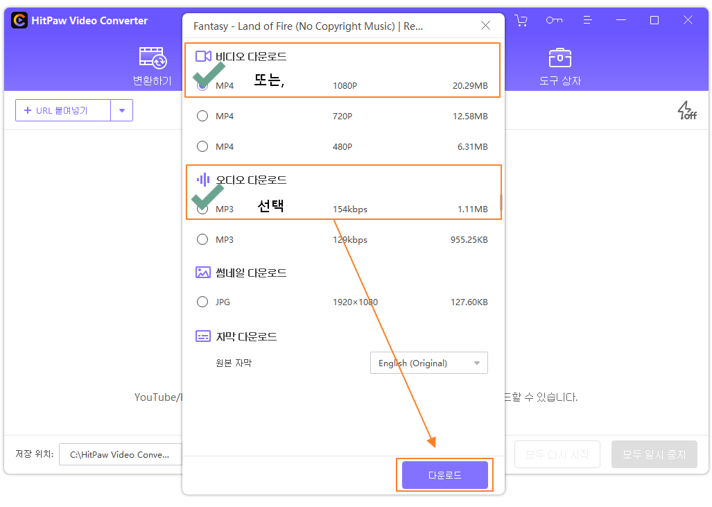 ④ 다운로드할 대상 선택(비디오/오디오/썸네일/자막) 후 다운로드