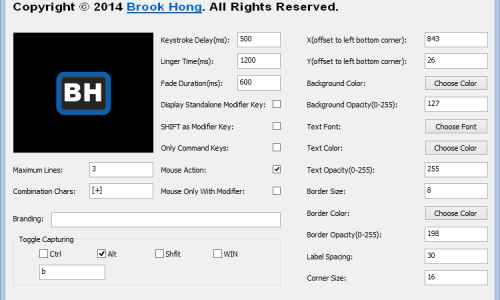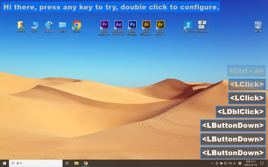 실행하면 아래 화면과 같이 왼쪽 상단에 메시지가 나오시 입력하는 키보드와 마우스 버튼이 오른쪽 아래에 표시됩니다.