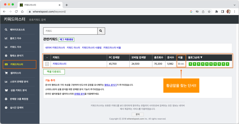 블로그 상위 노출 전략의 필수 도구! 연관(관련) 키워드 검색기 키워드 마스터 '웨어이즈포스트' 소개 및 기본 사용방법/비율로 찾는 황금키워드/내 블로그 지수 확인
