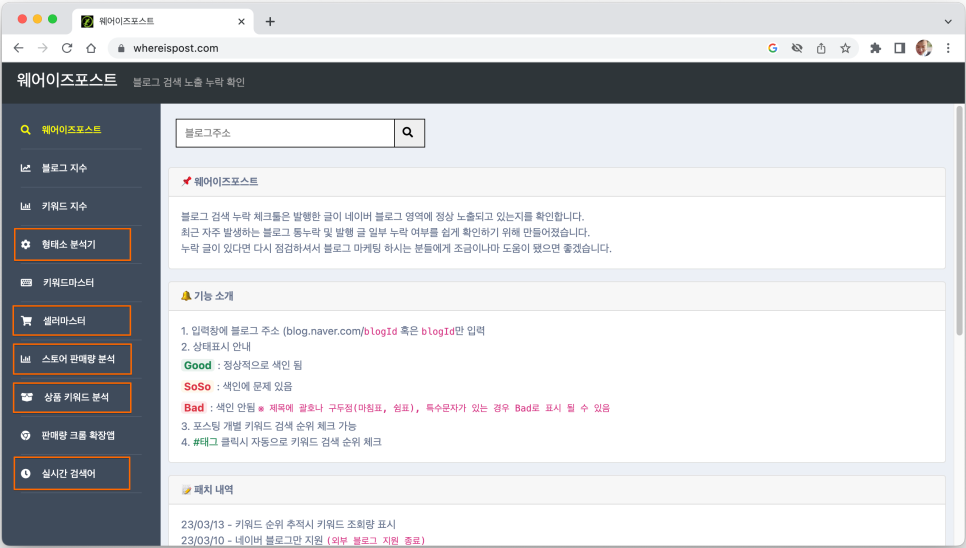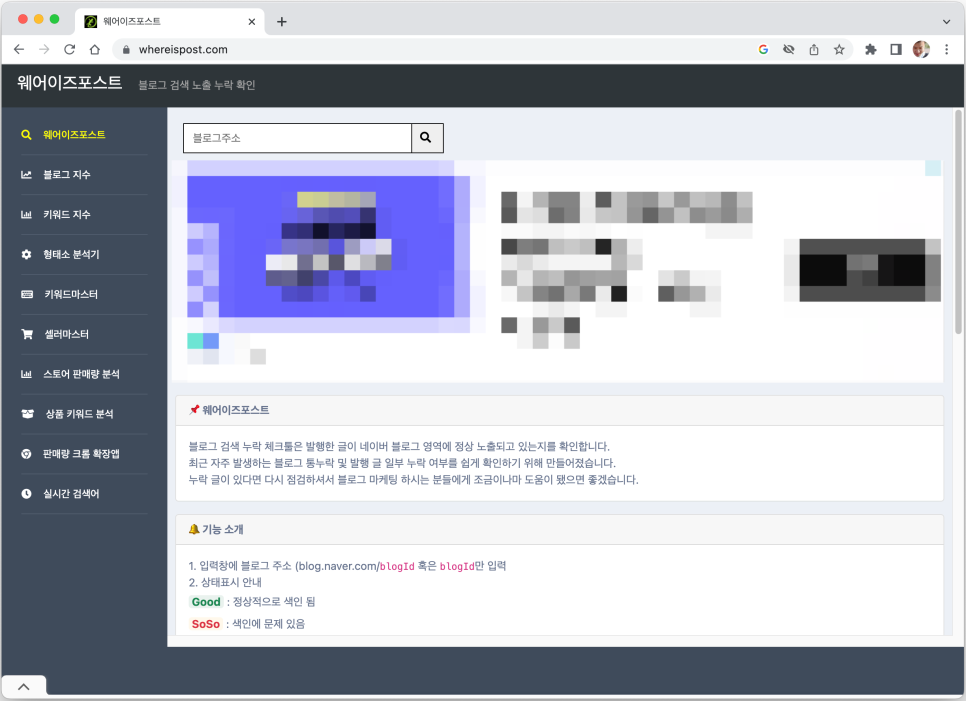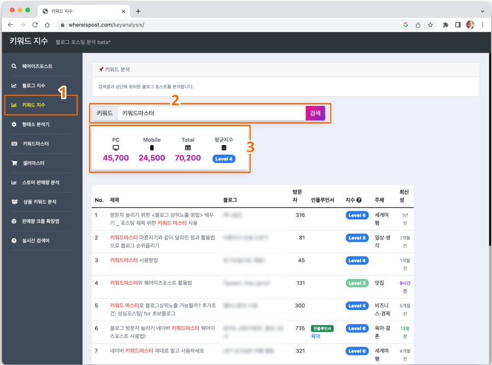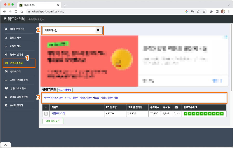 블로그 상위 노출 전략의 필수 도구! 연관(관련) 키워드 검색기 키워드 마스터 '웨어이즈포스트' 소개 및 기본 사용방법/비율로 찾는 황금키워드/내 블로그 지수 확인