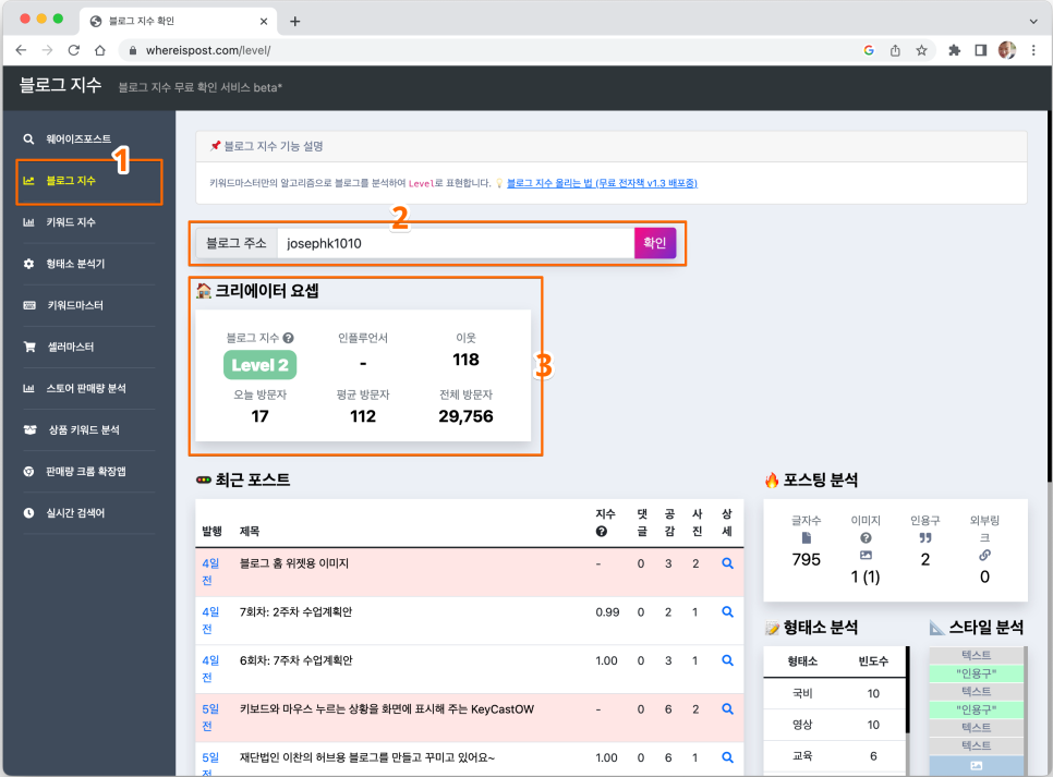 지수 아래에 보이는 글(포스트) 목록은 해당 키워드로 검색했을 때 상위에 노출되는 글이므로,