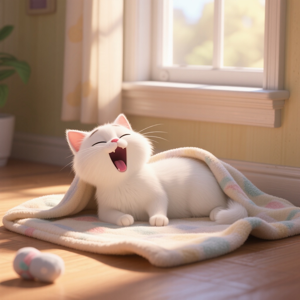 픽사 애니메이션 스타일. 예쁘고 귀여운 흰색 아기 고양이가 따스한 햇살이 비치는 방 안 창문 아래 엎드려 졸린 듯이 하품을 한다. 바닥에는 포근한 아기 담요가 깔려있다.