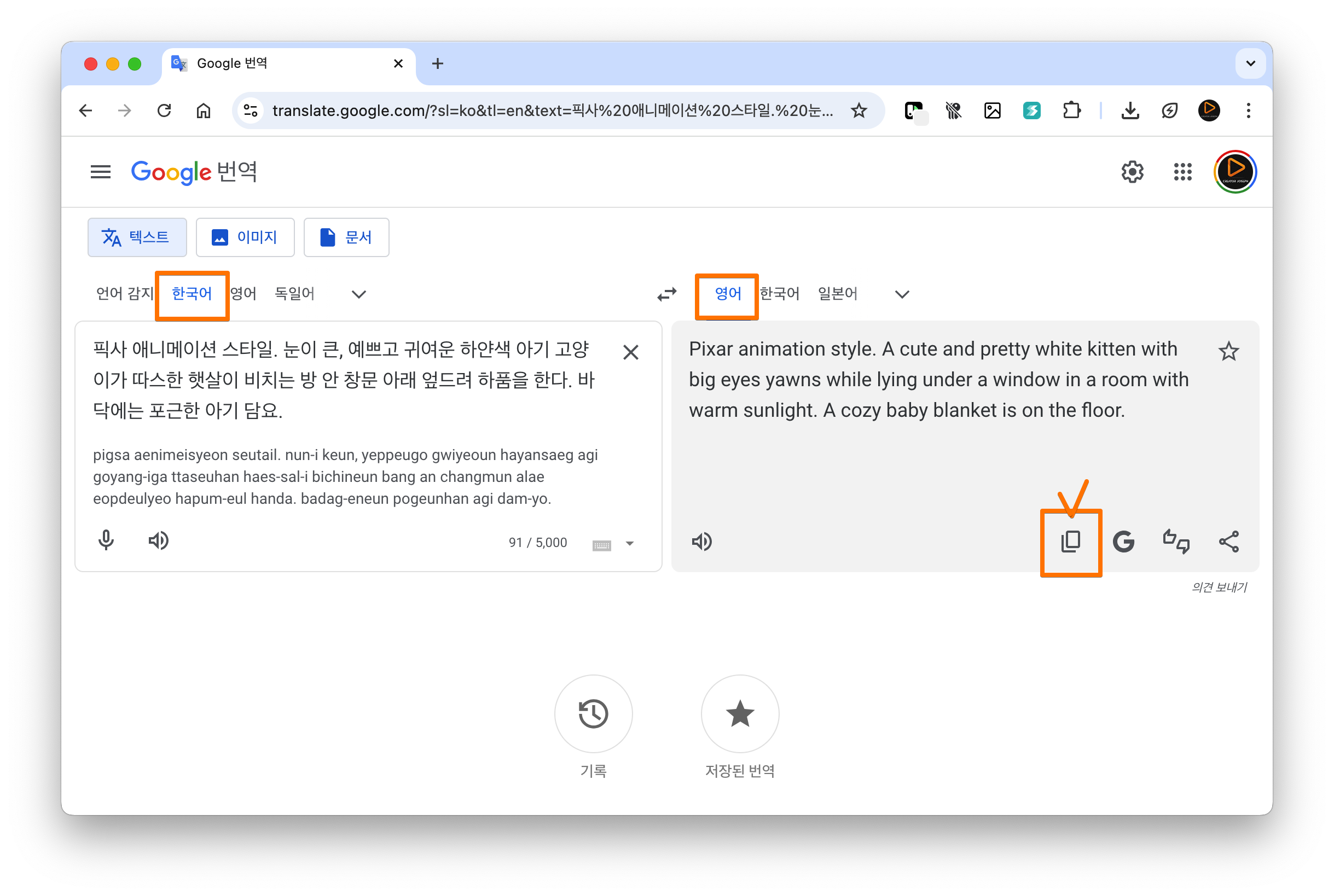 구글 번역기에 접속한 후 왼쪽은 한국어, 오른쪽은 영어를 선택합니다.