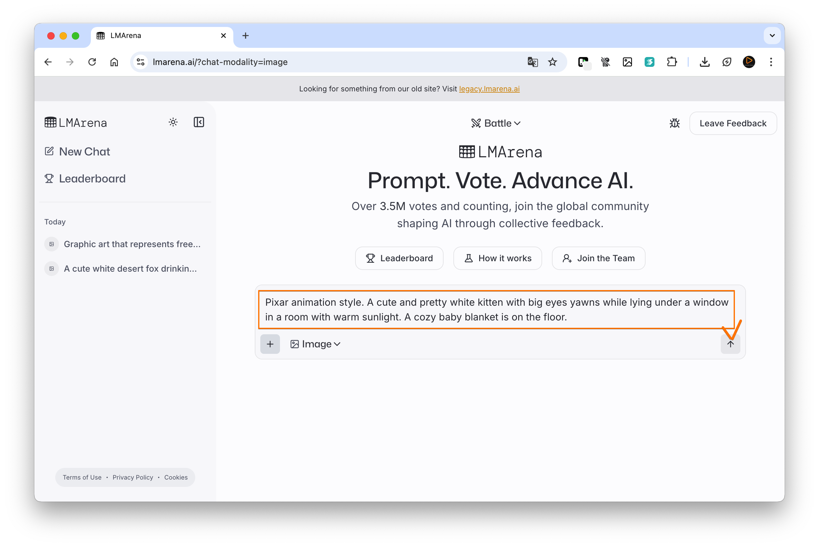LMArena 사이트 접속 후 아래 Chat 부분을 클릭하여 image 를 선택하세요.