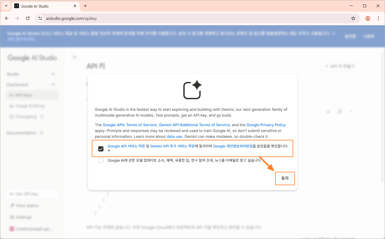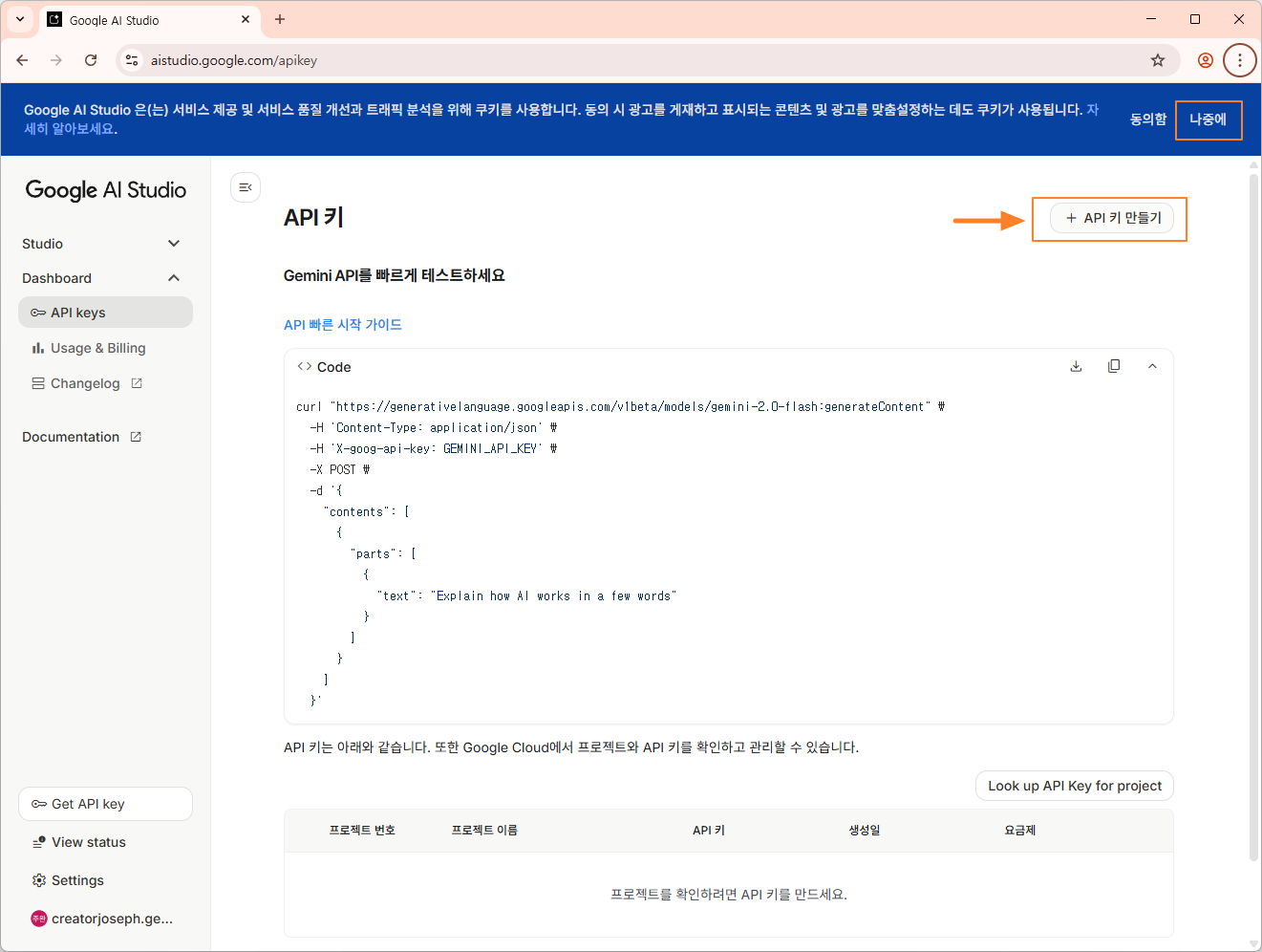 Google Ai Studio에서 Get API Key 생성시 Google Cloud 프로젝트 만들기