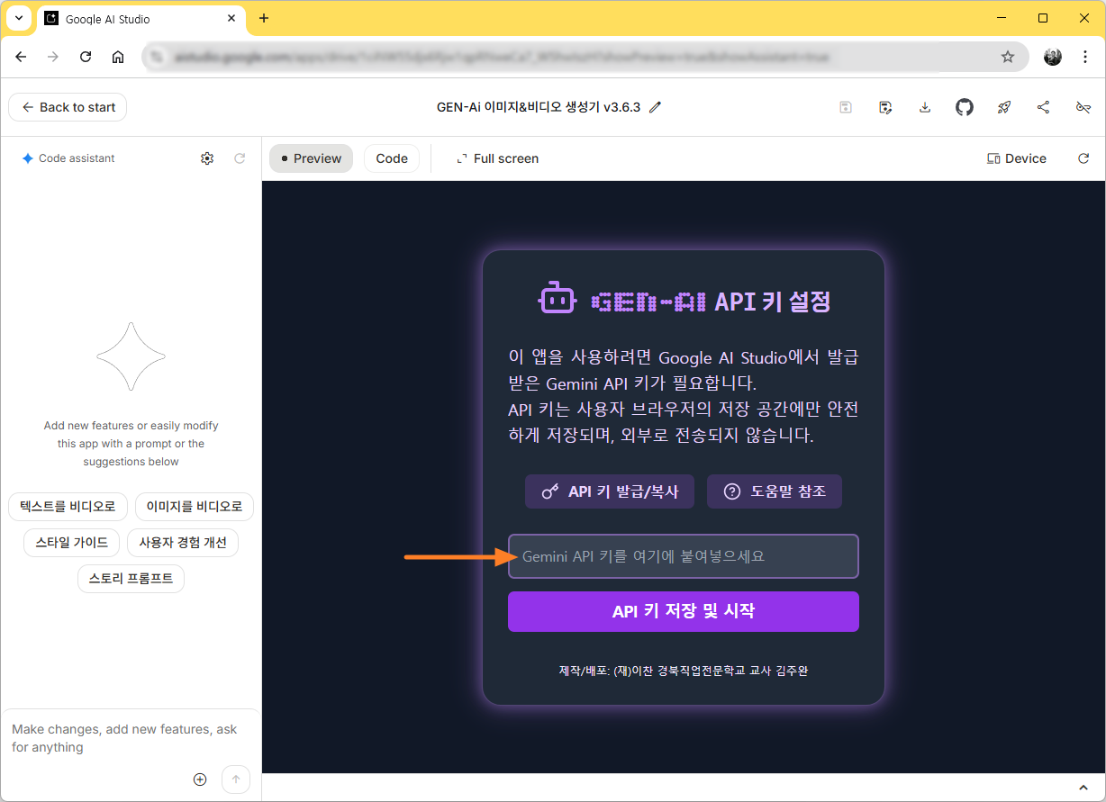 단, AI 기능을 사용하기 위해서 API 키라는 것을 사용하게 되는데, 이 키는 처음 앱을 개발한 계정의 API키를 공용으로 사용하므로 개발한 앱을 다른 사람에게 공유하여 사용하게 하면 일일 사용 할당량을 금방 소진해 버려 사용할 수 없는 불편함을 겪게 됩니다. 그래서 개인 계정의 API키를 등록하여 사용하는 방법으로 유도하는 것이며, 그때 이 글의 API 생성과 복사 방법이 필요하게 됩니다.