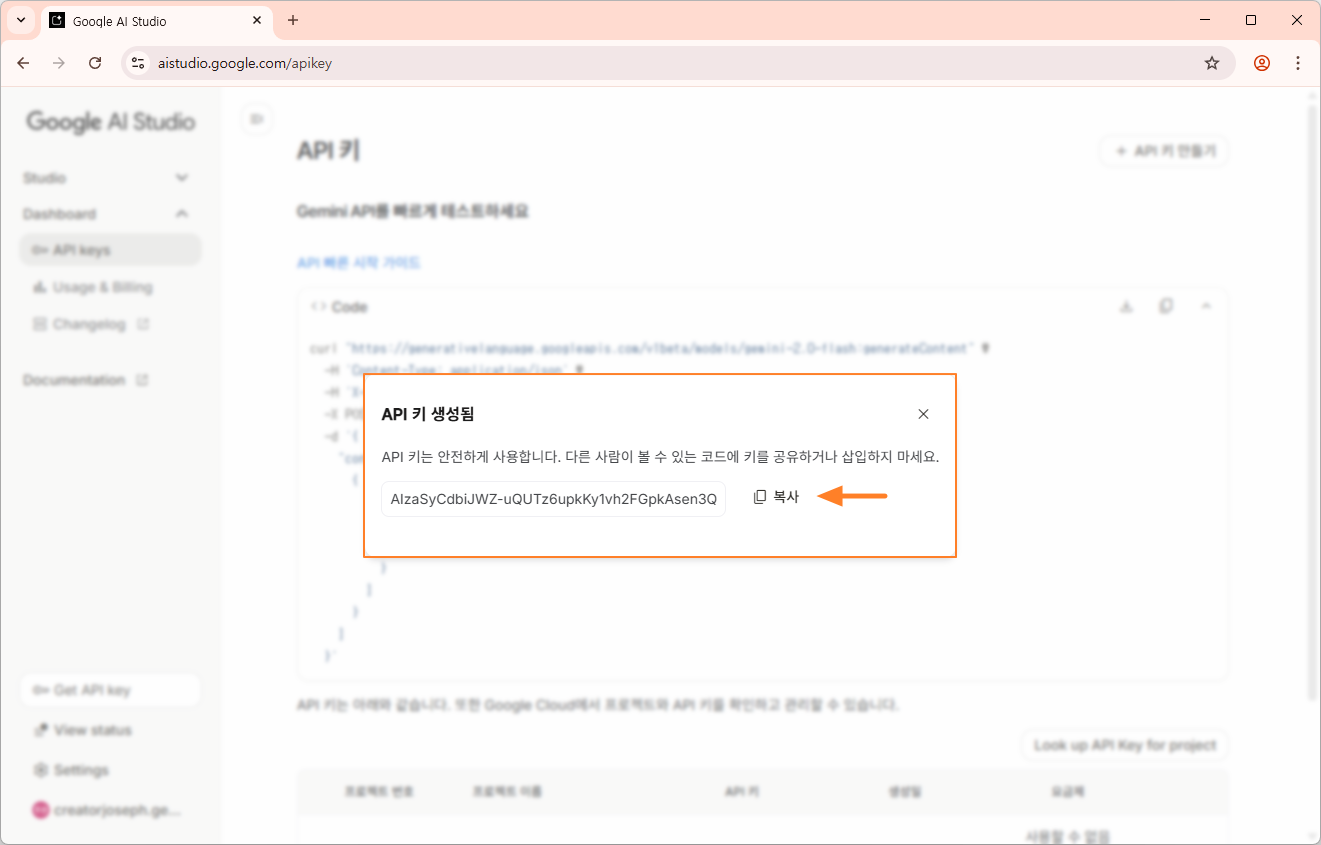 API 키 생성됨 창이 뜨면 복사 버튼을 클릭합니다.