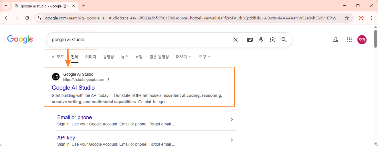 인터넷에서 'google ai studio'를 검색하고, 검색된 결과에서 아래와 같은 제목을 찾아서 클릭합니다.