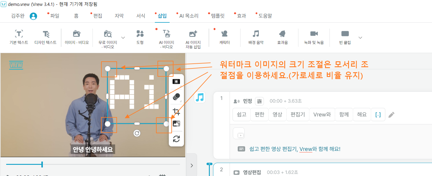워터마크의 크기 조절은 모서리 조절점을 이용하여 가로/세로 비율을 유지하시기 바랍니다.