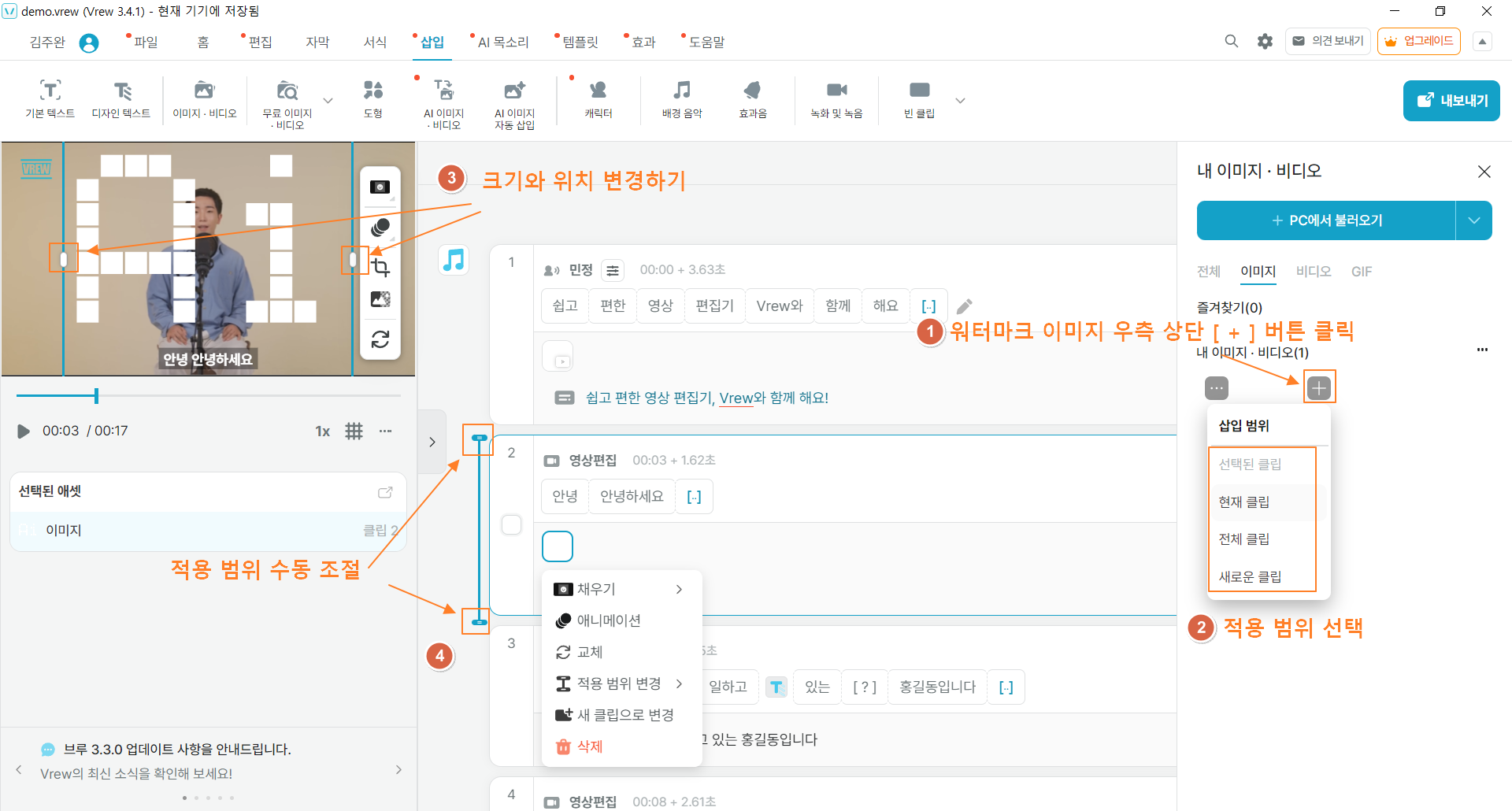 아래 순서대로 진행하여 불러온 워터마크를 적용하고 크기/위치/범위를 설정하세요.