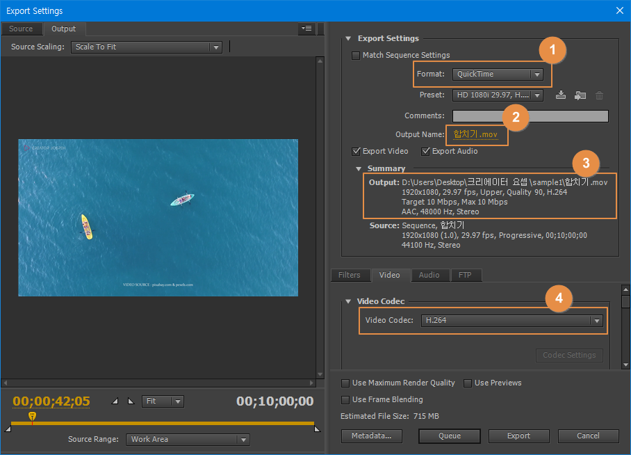 ④ 영상코덱 : QuickTime은 H.264 코덱을 사용함