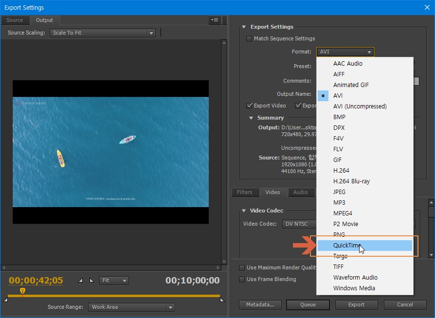 Export Settings 의 Format 을 누른 후 QuickTime 선택