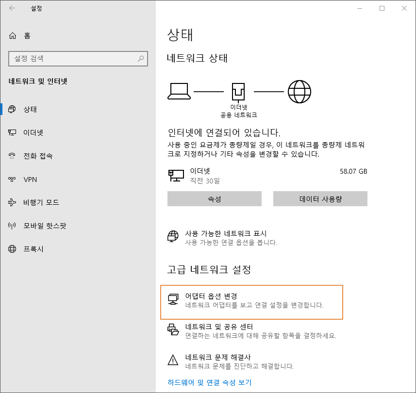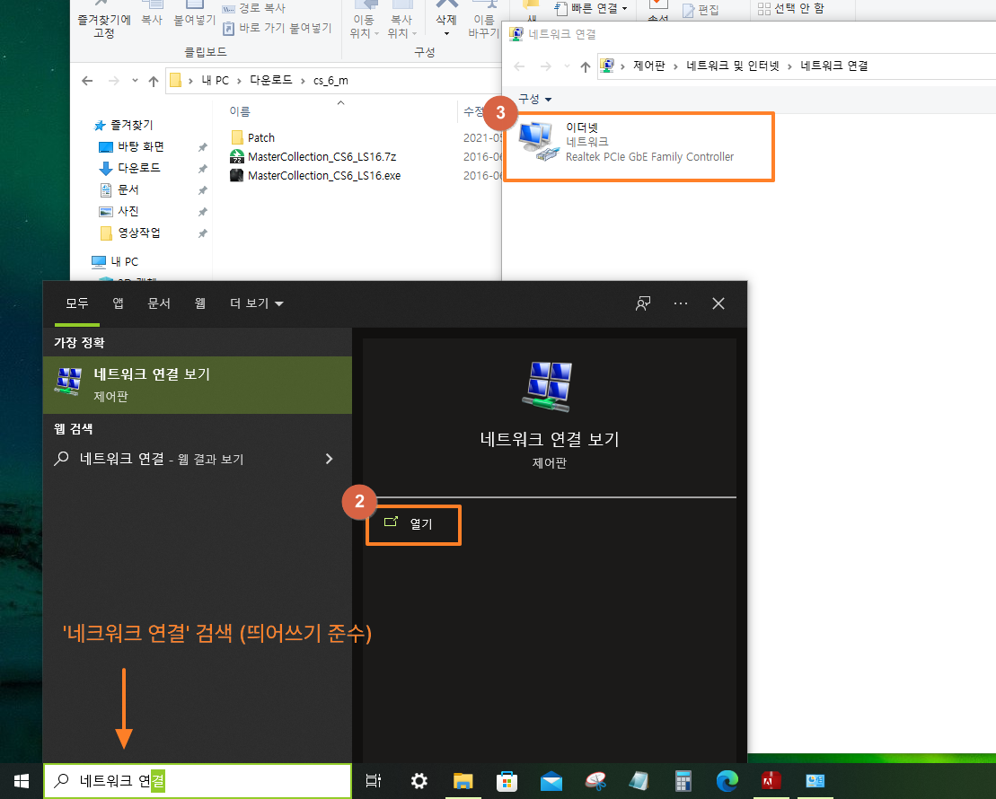 ① 시작 버튼 옆의 검색칸에 '네크워크 연결' 입력