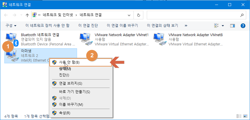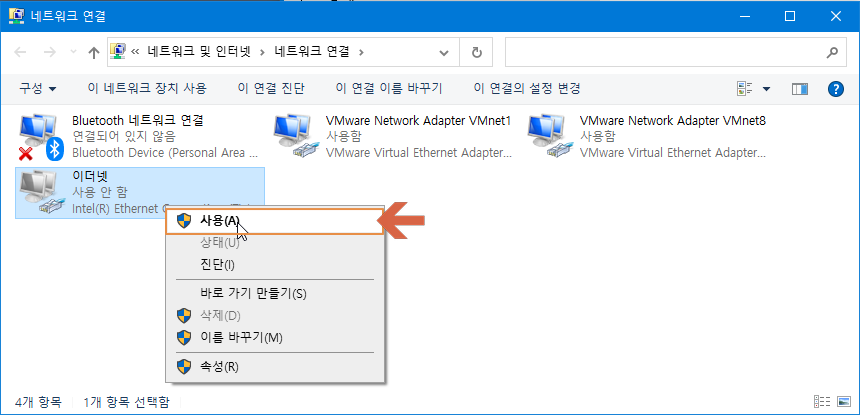 열어 둔 네트워크 연결 창에서 이더넷 부분 선택 후 마우스 오른쪽 버튼 눌러 '사용'을 선택합니다.