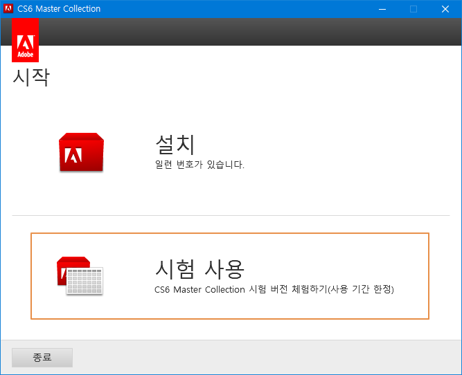어도비 제품의 setup.exe를 실행하고 잠시 기다리면 아래와 같은 창이 뜨면 '시험 사용'을 선택합니다.