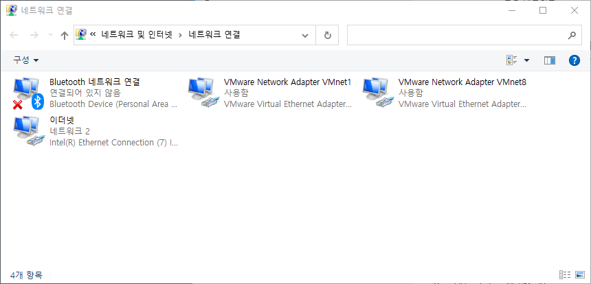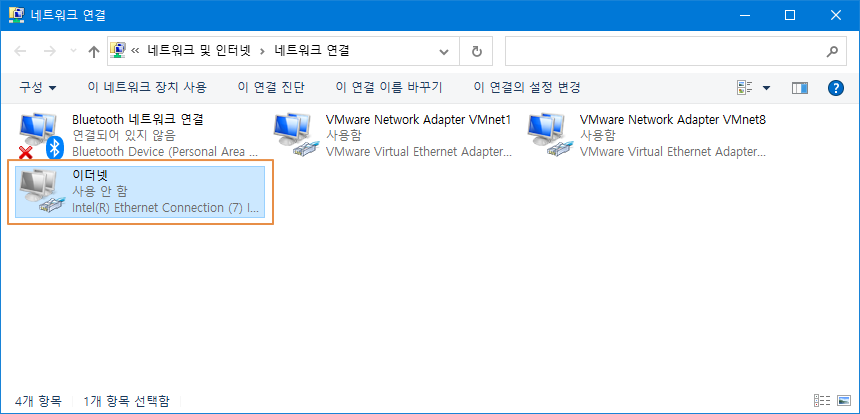사용 안 함을 선택하면 아래와 같이 이더넷 부분이 회색으로 바뀌며 상태가 - 사용 안 함으로 바뀝니다.