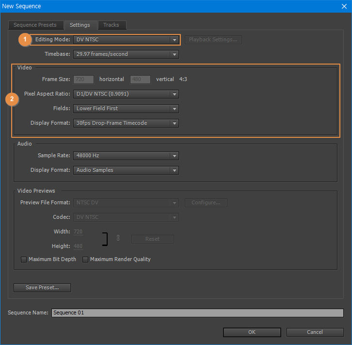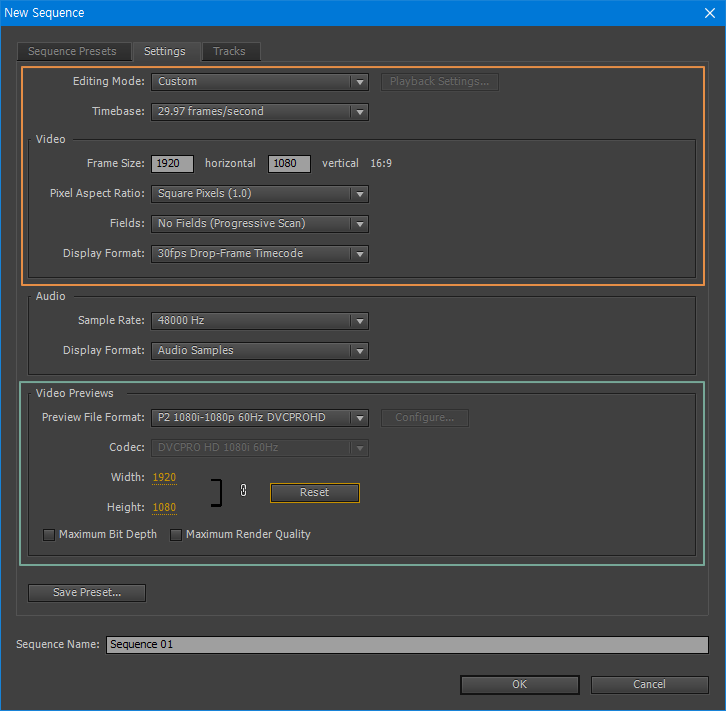 시퀀스(Sequence)란 제작할 영상의 규격이라고 생각하시면 되는데요, 영상과 오디오의 규격을 사전 설정하는 과정입니다.