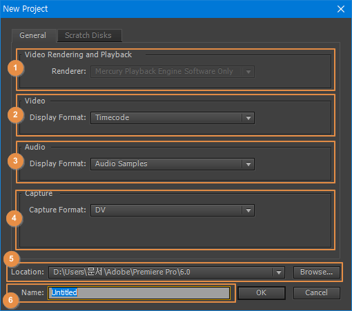새로운 영상제작을 위해 New Project를 선택하면 아래와 같은 창이 뜨는데요, 당황하지 말고 ⑤번과 ⑥번 항목만 보세요.