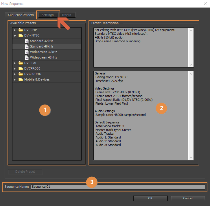 시퀀스(Sequence)란 제작할 영상의 규격이라고 생각하시면 되는데요, 영상과 오디오의 규격을 사전 설정하는 과정입니다.