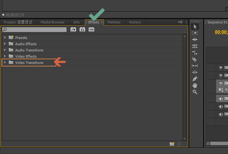 샘플 영상을 추가해 두었던 부분에 보면 Effects라는 탭이 있습니다. 그 부분에 장면 전환 효과 기능이 있습니다.