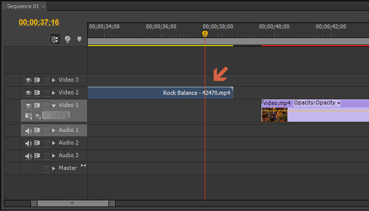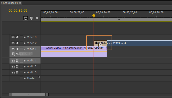 두 번째 영상을 클릭한 상태에서 드래그하여 Video 2 트랙으로 올립니다.