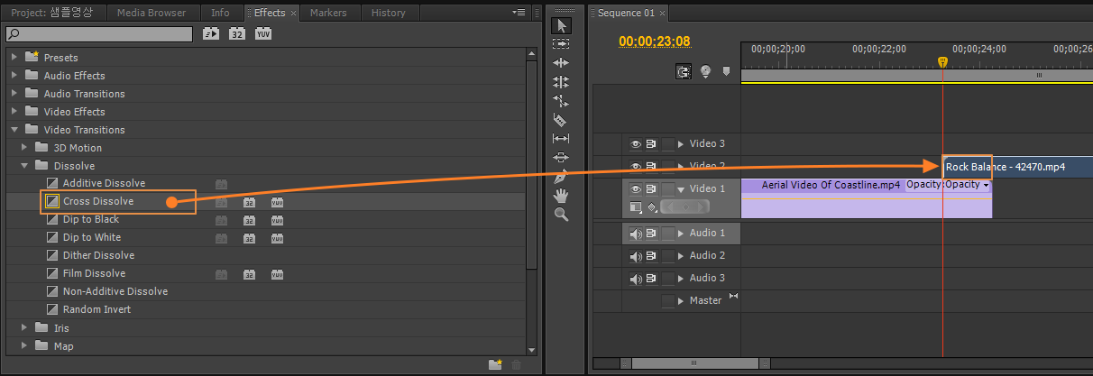 옮겨놓은 상태에서 Cross Dissolve 효과를 두 번째 영상 앞쪽에 끌어다 놓습니다.
