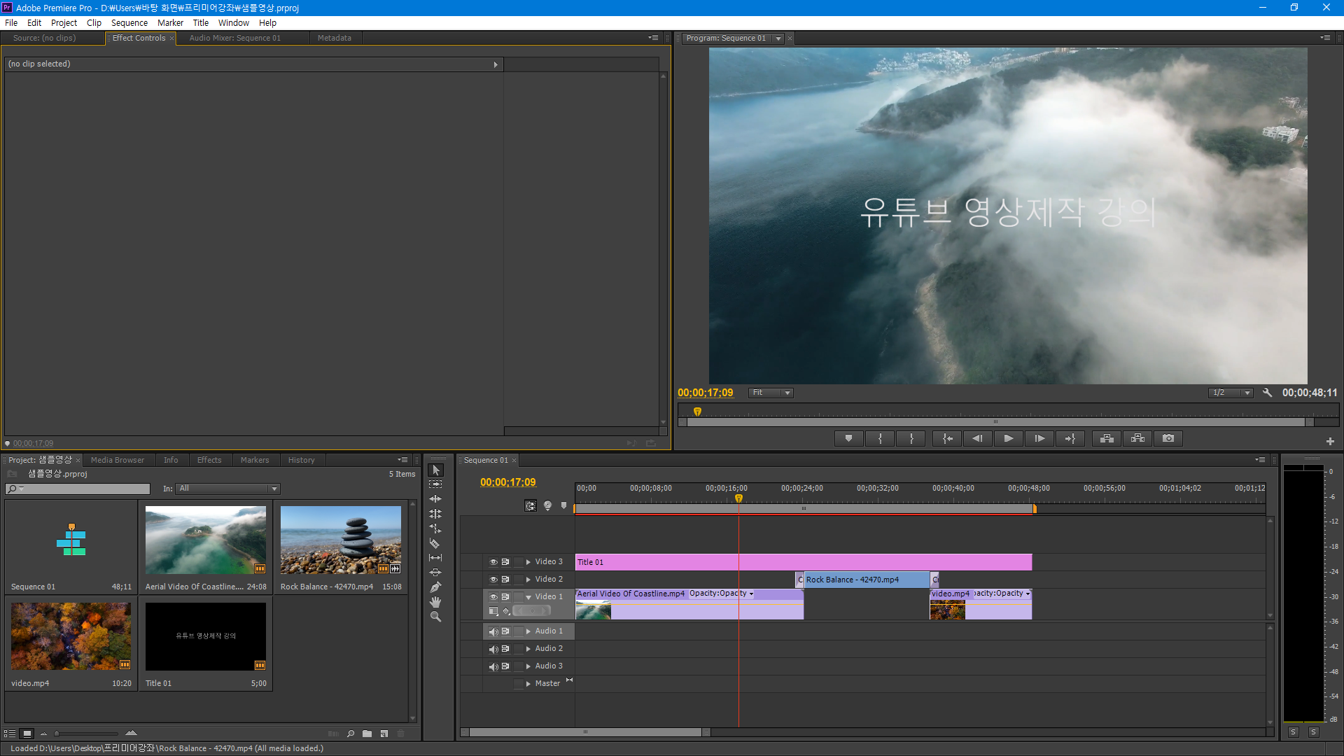 각자의 PC에서 마지막 저장할 때의 모습 그대로 열리게 되므로 타임라인의 재생 헤드(적색선)의 위치와 프로젝트 창의 모습 등이 위와 다를 수 있습니다.