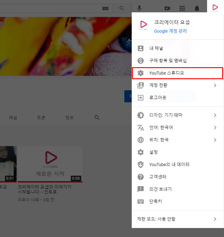 YouTube 스튜디오 들어가기