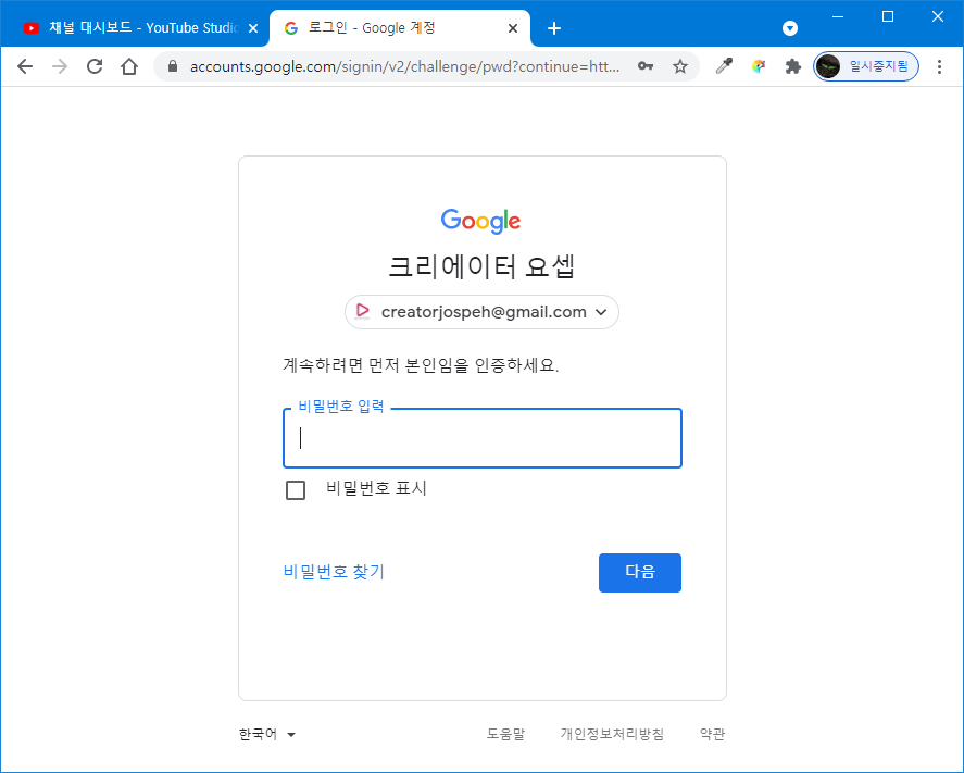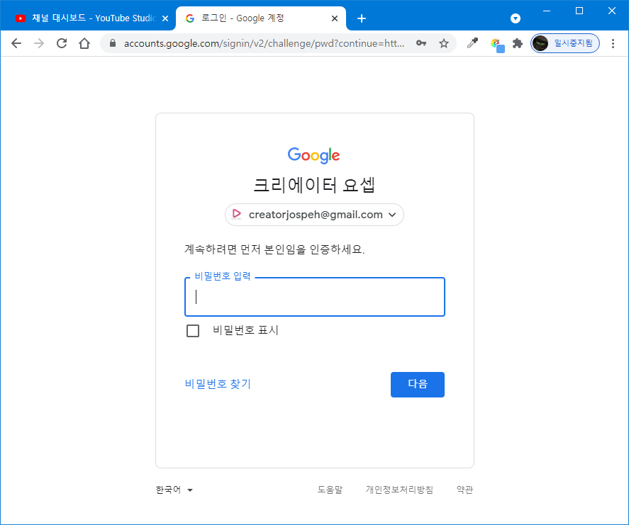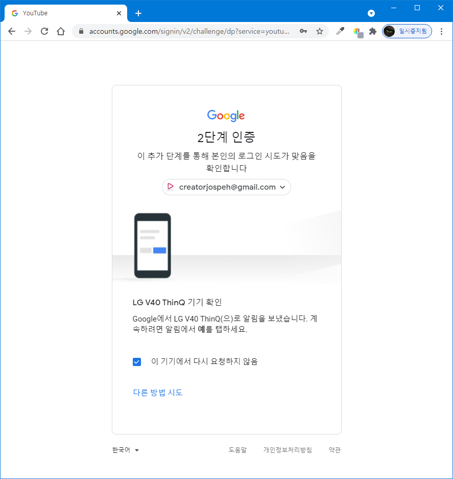 구글이나 Youtube에서 로그인을 시도하면 아래와 같이 2단계 인증과정이 진행됩니다.