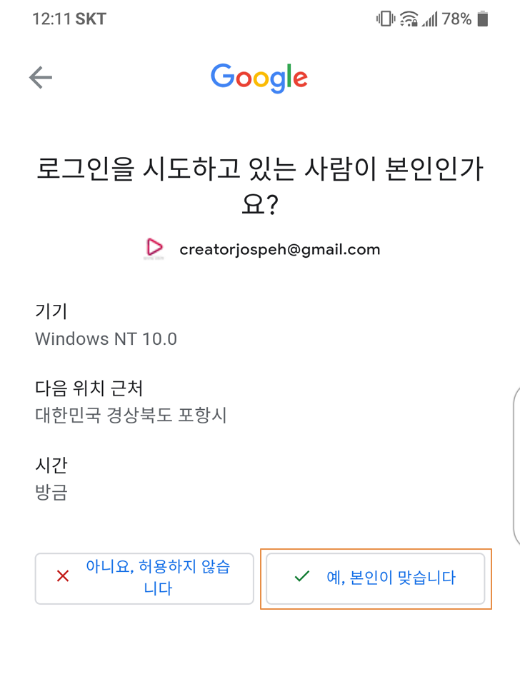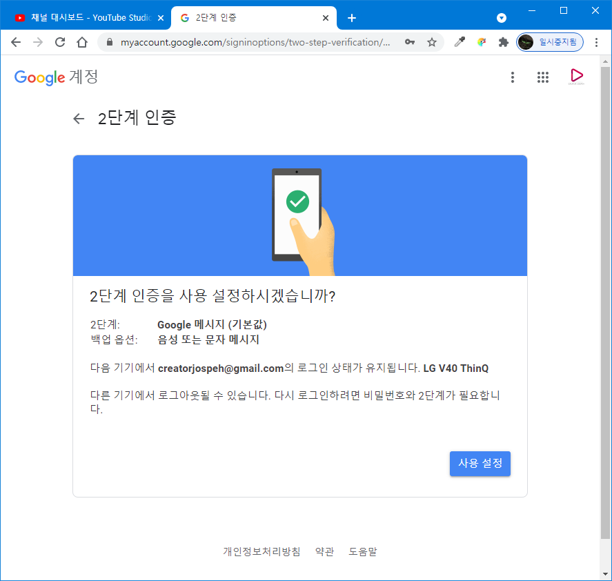 이 후 구글계정으로 로그인 할 때 등록된 휴대전화로 추가 인증을 해야 로그인이 됩니다.