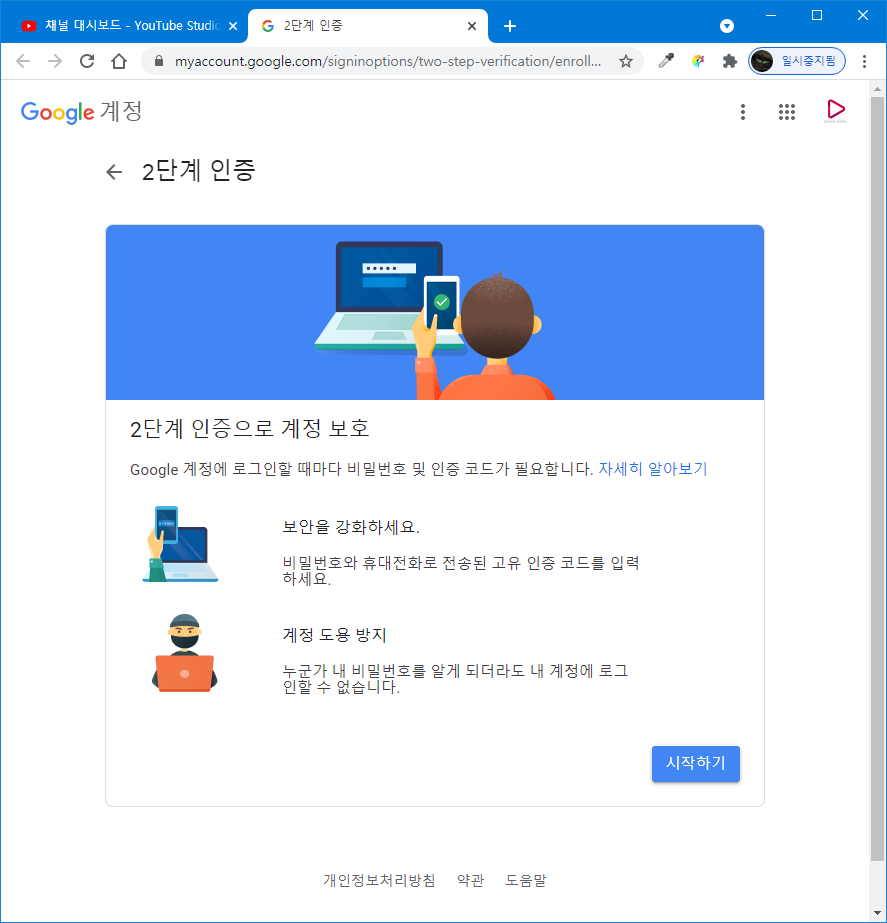 2단계 인증 과정이 시작되었습니다. [시작하기] 를 누릅니다.