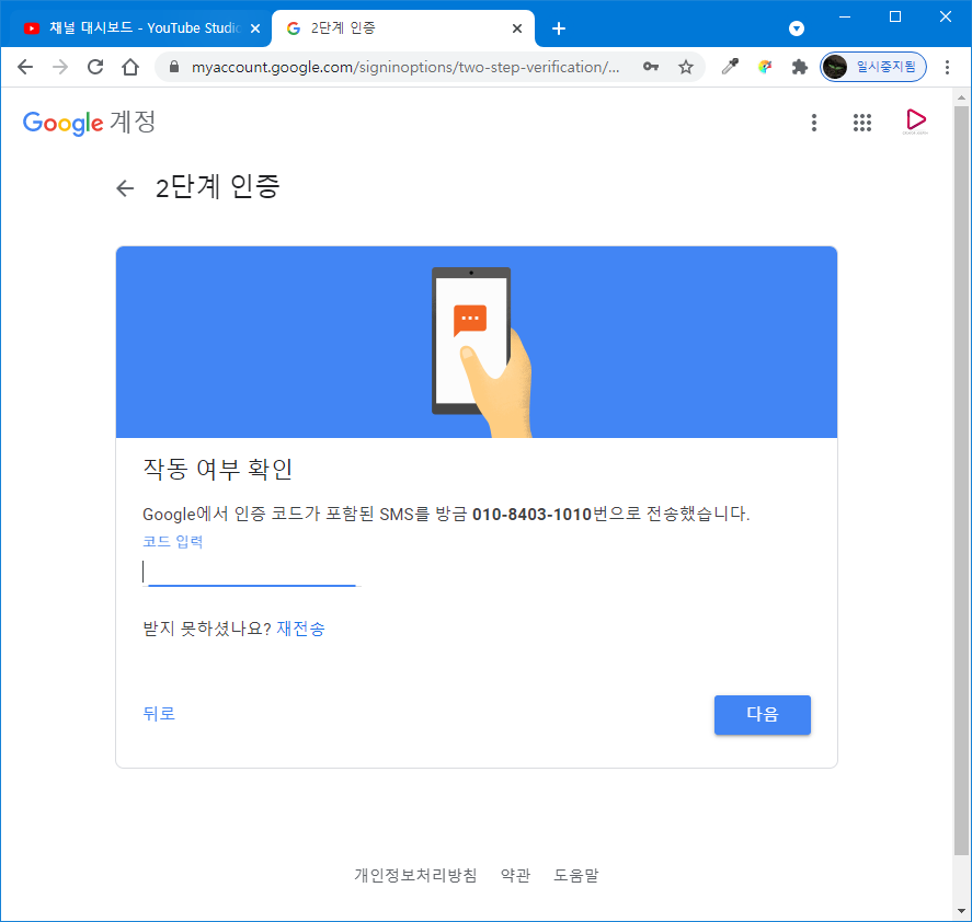 이 후 구글계정으로 로그인 할 때 등록된 휴대전화로 추가 인증을 해야 로그인이 됩니다.